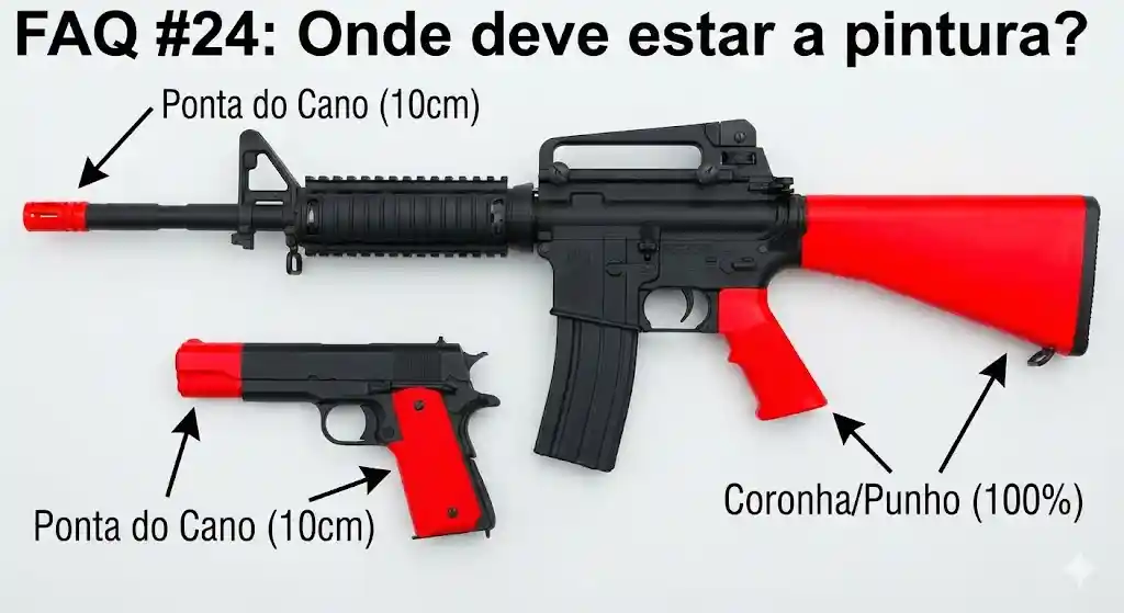 Na ponta do cano (10cm para armas longas e 5cms para curtas) e em 100% da coronha nas armas longas, ou punho nas Curtas.