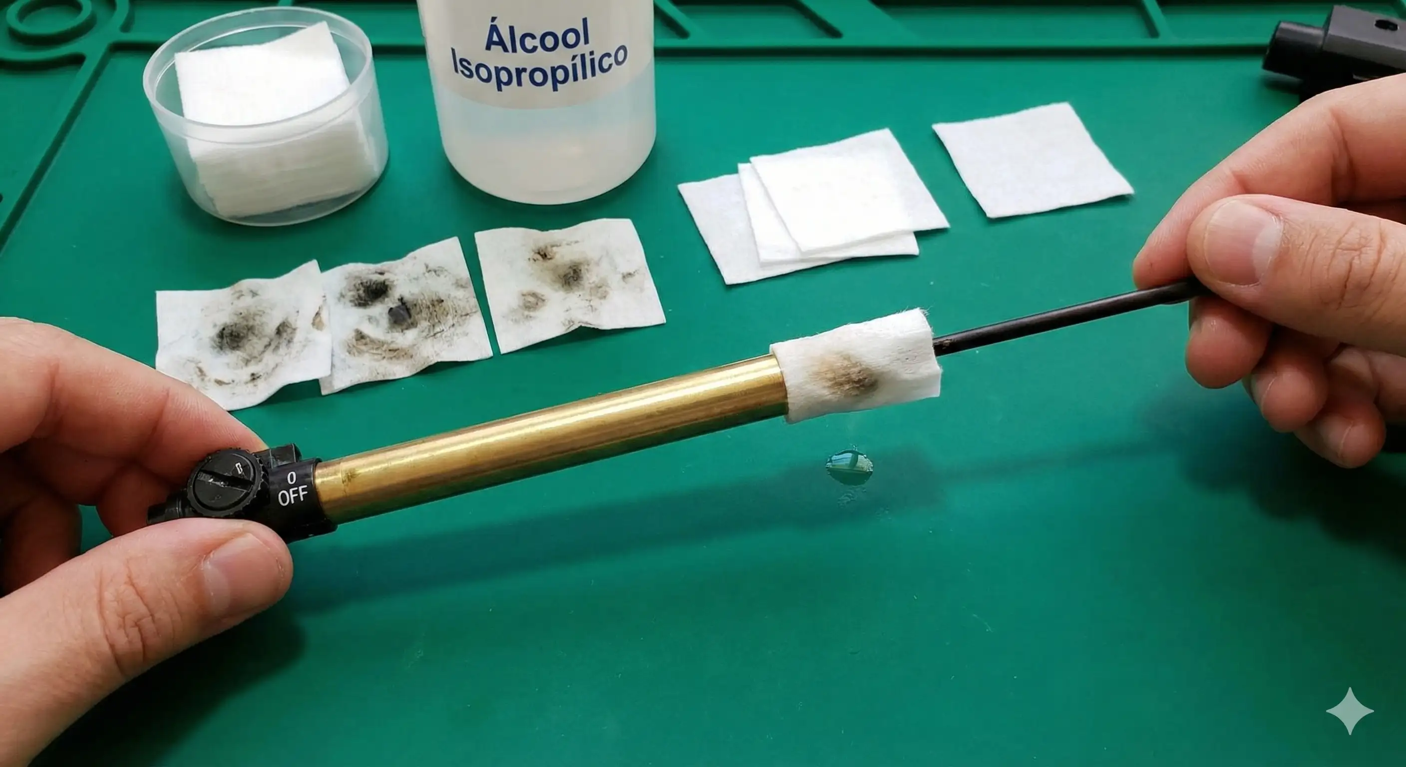 Passa a vareta com papel e álcool isopropílico até sair limpo.
