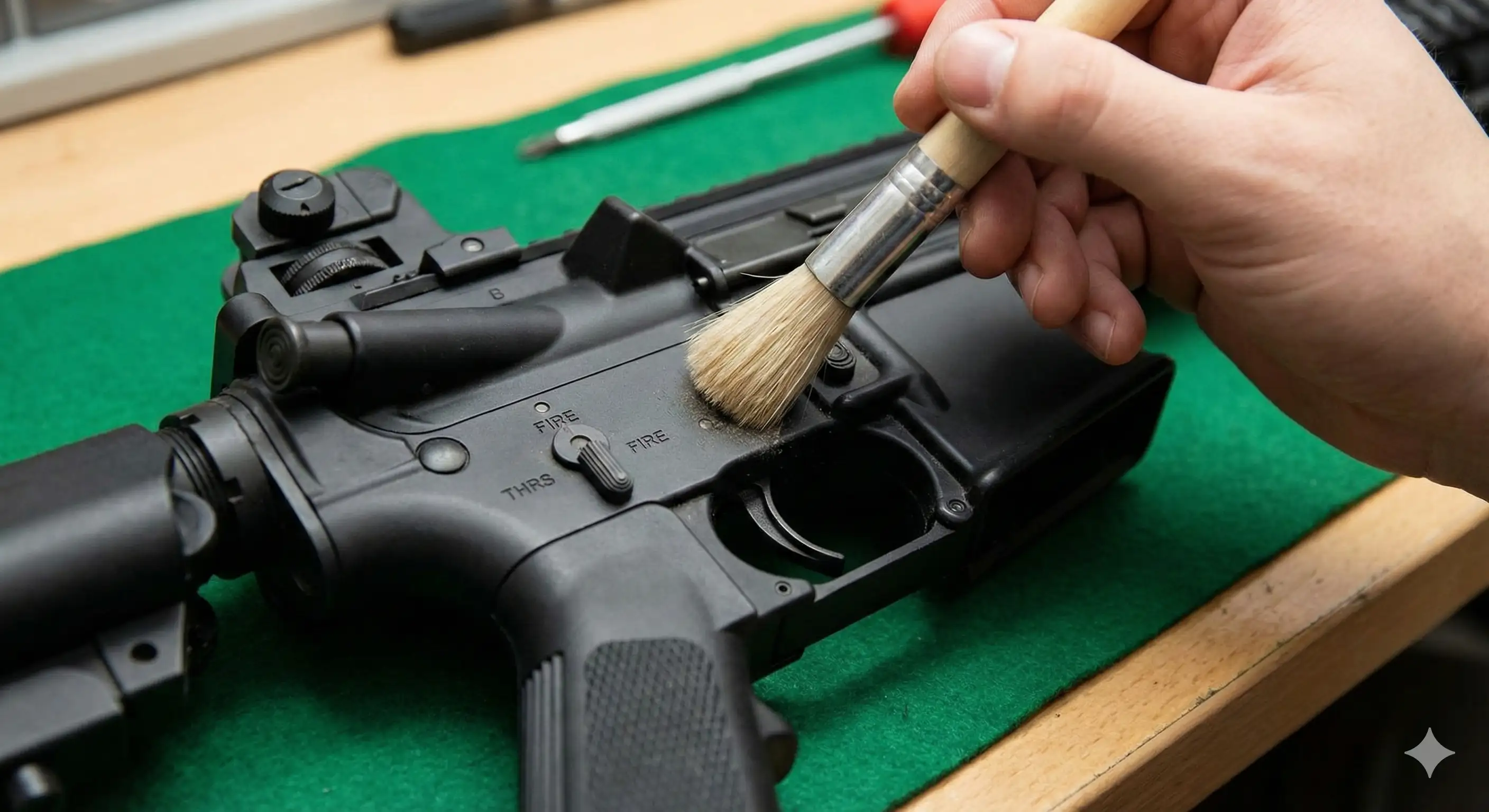 Remoção de Poeira: Usa um pincel macio nos trilhos, seletor de tiro e gatilho.