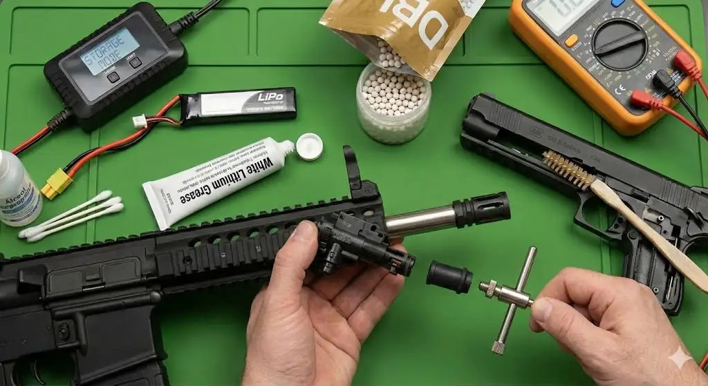 Segurança: Antes de iniciar qualquer manutenção, garante que a arma não tem bateria ligada nem BBs no cano.