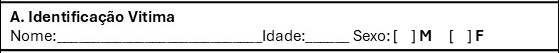 Preencher com os dados de identificação da Vitima: _________________________________ Nome: Nome da Vitima _________________________________ Idade: Idade correcta ou aproximada ________________________________ Sexo: Assinalar com uma cruz Masculino ou Femenino