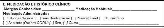 ______________________________________ Registo de medicação habitual da vitima e administrada pelo socorrista: ___________________________________ Alergias: colocar alergias conhecidas ___________________________________ Medicação Habitual: Medicação que a vitima disse que tomava __________________________________ Glucose/açúcar: Administra em caso de Hipoglicemia (apenas por indicação do paciente ou do codu) ___________________________________ Paracetamol: Para as dores, (apenas por indicação do paciente ou do codu) ___________________________________ Ibuprofeno: para dores e anti inflamatorio (apenas por indicação do paciente ou do codu) ___________________________________ Aspirina: Para dores e para enfartes de miocardio (apenas por indicação do paciente ou do codu)