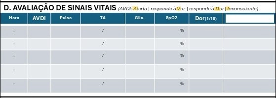 ___________________________________ Registo dos sinais vitais da vitima, o resgisto deverá ser feito com a periocidades adequada ao estado/gravidade da mesma. ___________________________________ Hora: Hora da avaliação __________________________________ AVDI: Colocar a letra correspondente ao estado de conciencia do paciente: -- (A) - Alerta, interage normalmente com o socorrista -- (V) - Sonolento, mas responde à voz -- (D) - Não comunica, mas responde à dor -- (I) - Inconsciente _________________________________ Pulso: batimentos por minuto da vitima, analise manual ou atraves de equipamento _________________________________ TA - Tensão arterial, Maxima e minima, a tensão normal de um adulto é de 120/80 __________________________________ Glic.: Nivel de Glicose no sangue, importante para avaliar hipoglicemia e HiperGlicemia __________________________________ SpO2: (Saturação Periférica de Oxigénio) mede a percentagem de hemoglobina oxigenada no sangue, indicando a eficácia da oxigenação ___________________________________ Dor: escala de dor de 0 a 10 (Escala Numérica) avalia a intensidade da dor, sendo 0 "sem dor" e 10 a "pior dor imaginável". Classifica-se geralmente como: 0 (sem dor), 1-3 (ligeira), 4-6 (moderada), 7-9 (forte) e 10 (insuportável). _______________________________ Existe um campo em branco para colocar outro tipo de avaliação não constante no cartão.