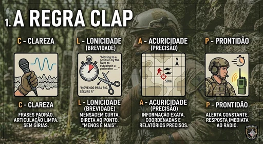 No Clube Bear, a rede rádio é um recurso partilhado e limitado. Se um operador ocupa a rede com conversa desnecessária, pode estar a impedir que um colega reporte um contacto inimigo ou peça assistência médica. A comunicação tática baseia-se em quatro princípios fundamentais, conhecidos como a regra CLAP.