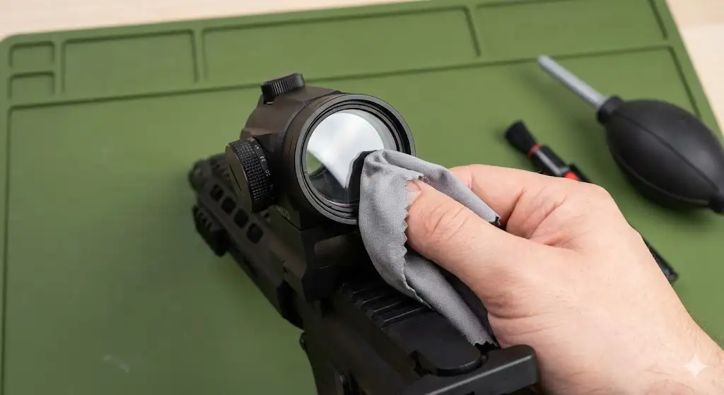 Ópticas: Limpa as lentes de Red Dots/Scopes apenas com panos de microfibras para óculos.