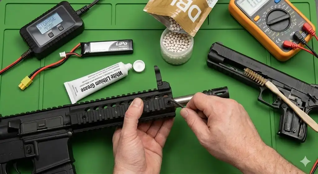 Segurança: Antes de iniciar qualquer manutenção, garante que a arma não tem bateria ligada nem BBs no cano.