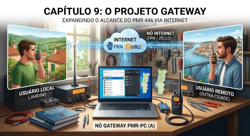 Como vimos no Capítulo 5, o alcance do PMR 446 é limitado pela linha de vista. Mas e se pudesses usar a internet como um "repetidor gigante"? É exatamente isso que um Gateway faz: liga o sinal de rádio de uma antena local a uma rede mundial.